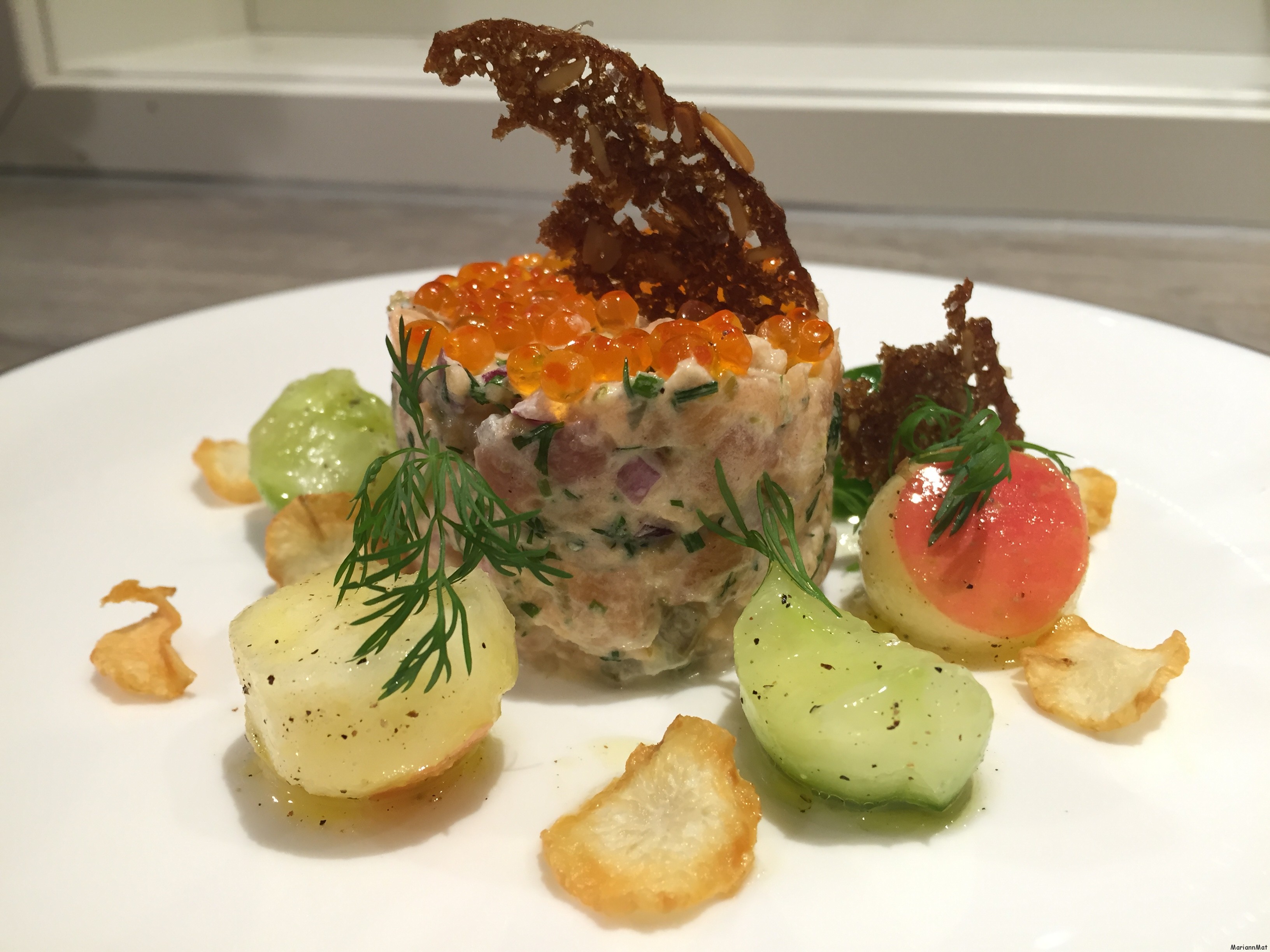 Laksetartar med Eple- og Agurksalat, Friterte Jordskokkchips og Rugflak (1) ← Forrige Neste → Tweet Buffer Pin It Les mer
